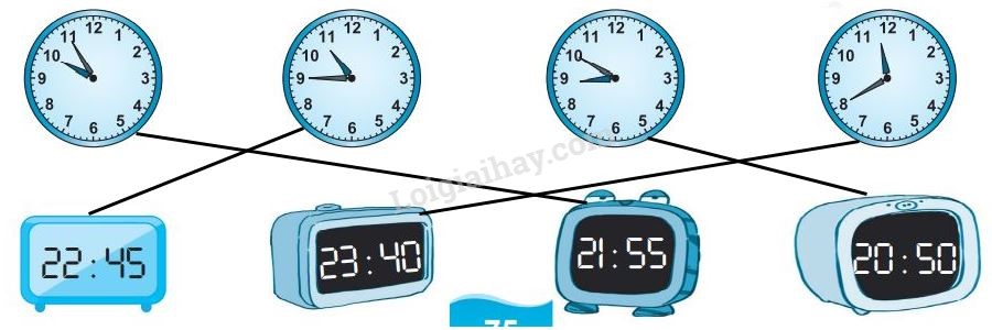 Xem giờ rồi nối với đồng hồ điện tử chỉ cùng giờ (buổi tối)