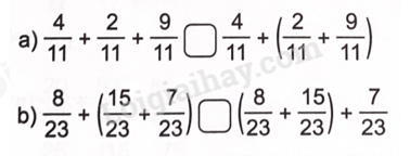Áp dụng tính chất kết hợp của phép cộng rồi điền dấu thích hợp vào ô trống.