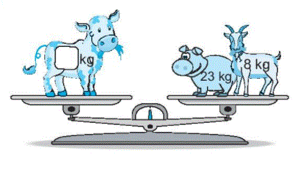 – Tính tổng số câng nặng ở đĩa cân bên phải ta tính được cân nặng của chú bò bên trái.