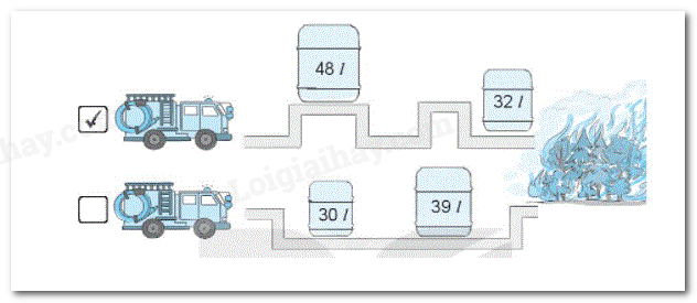 Mỗi xe cứu hỏa đến đám cháy theo một con đường. Mỗi xe sẽ lấy hết nước trong bình đặt trên con đường đó. Đánh dấu  vào ô trống đặt trước xe lấy được nhiều nước hơn.