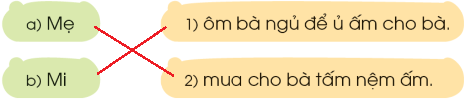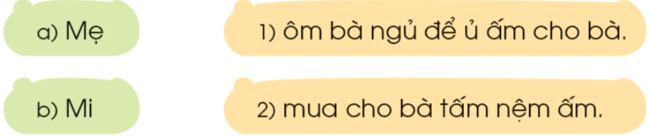 Đêm đó, Mi nằm ôm bà ngủ. Bà thì thầm: “Bé Mi của bà ấm quá! Ấm như bếp lửa đỏ đượm”.