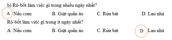 Đếm số ngày Rô-bốt sẽ nấu cơm, rửa bát, giặt quần áo và lau nhà rồi điền thông tin vào chỗ chấm hoặc chọn đáp án thích hợp.