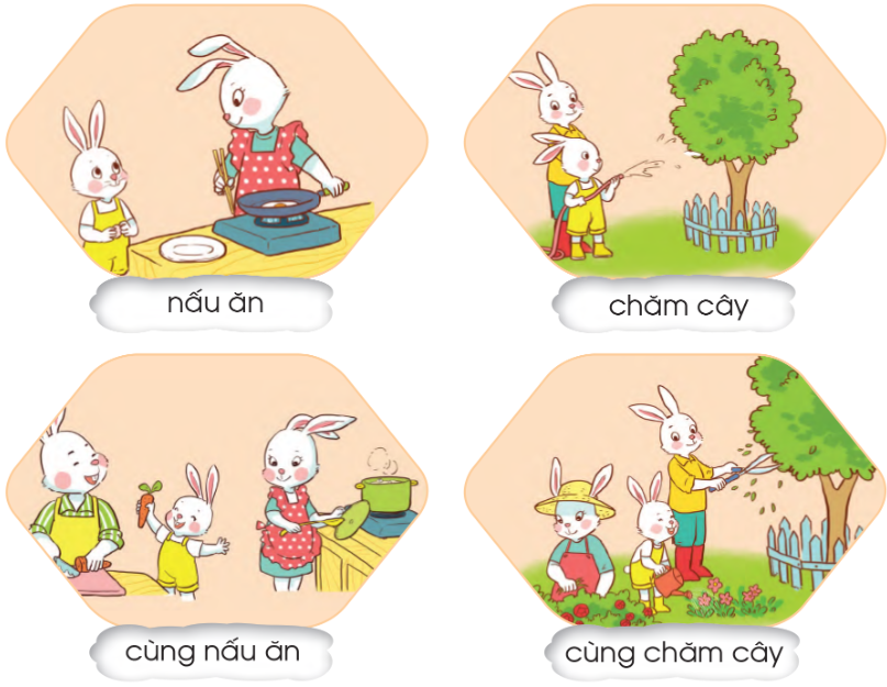 b. Hai mẹ con thỏ cùng ra vườn giúp bố chăm cây.