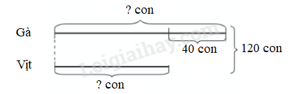 Trên sân cả gà và vịt có 120 con, trong đó gà nhiều hơn vịt là 40 con. Hỏi trên sân có bao nhiêu con gà, bao nhiêu con vịt?