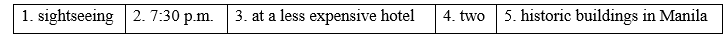 7. Listen to a dialogue about a holiday plan and fill in the gaps (1-5). Write NO MORE THAN TWO WORDS AND/OR A NUMBER for each gap.