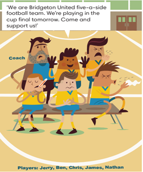 1. Look at the picture. Why is tomorrow a big day for Bridgeton United? 2. How do you say the phrases below in your language? 3. Use the Vocabulary box to complete the sentences. 4. Listen to five short extracts between the coach and the players. Complete the sentences. 5. Listen again and answer the questions. 6. In pairs, ask and answer the questions.
