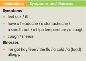 – have a headache / a stomachache / a sore throat / a high temperature / a cough: (nhức đầu / đau bụng / đau họng /nhiệt độ rất cao / ho)