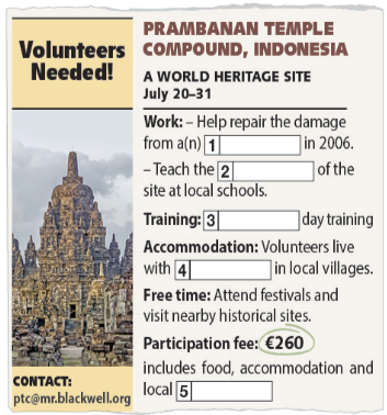 1. Listen to an interview about a visit to the Pyramids of Giza, a World Heritage Site. Put the places (A-F) the speakers mention in the correct order. There is one example. 2. Listen again. For questions (1-3) choose the best answer (A, B, C or D). 3. You are going to listen to a teacher talking about a volunteer programme. Read the advert. What type of word is missing in each gap? 4. Listen and fill in the gaps (1-5) in Exercise 3. Write ONE WORD AND/OR A NUMBER for each answer.