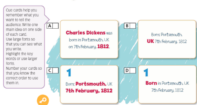 Cue cards help you remember what you want to tell the audience. Write one main idea one side of each card. Use large fonts So that you can see what you write. Highlight the key words or use larger fonts.