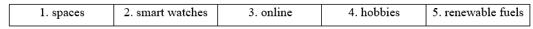 The city of the future will be a very exciting and high-tech place. Homes will have solar power and many rooftops of buildings will have green 1)_______ In our homes, we will have robots to help us and we use devices like 2)_______ to communicate with them. We will have a lot of free time to enjoy our lives. Education and work will take place 3)_______ but socialising in person will still be very important. The city will have many parks, restaurants and cafés for meetings. We will have more time for things such as 4)_______. and travel, and group activities and sports will be popular. Transport will be fast and energy-efficient with 5)_______ that will communicate between them. A serious problem of the future city is that it will be crowded.
