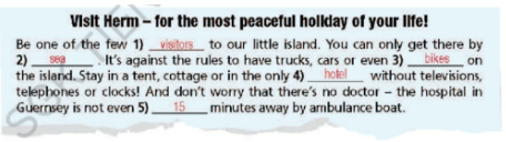Khoảng một trong ít du khách đến với hòn đảo nhỏ của chúng tôi. Bạn chỉ có thể đến đây bằng biển. Luật lệ ở đây khác đều không có xe tải, xe hơi, xe đạp để dùng trên hòn đảo. Ở trong lều, trại hoặc khách sạn duy nhất mà không có ti vi, điện thoại hoặc đồng hồ! Và tôi không lo lắng rằng ở đây không có bác sĩ – bệnh viện ở Guernsey thì thậm chí chỉ cách 15 phút đi bằng thuyền cứu hộ.