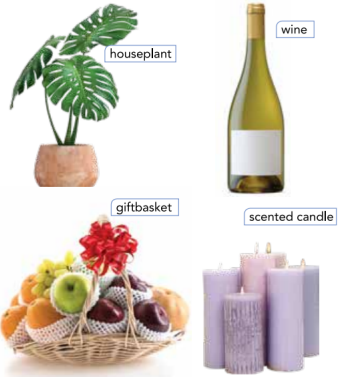(Nhìn vào những bức ảnh. Thảo luận các câu hỏi sau theo cặp. Bạn sẽ mang món quà nào trong số những món quà này đến bữa tiệc tân gia? Tại sao?)