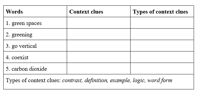 1. Look at the photos. In pairs, discuss: Do you want to live in places like these? In what ways can public spaces be made greener for future cities? 2. Read the article. Find the clues that help you identify the meanings of highlighted words and write them in the table below. Then match them with the types of context clues given.