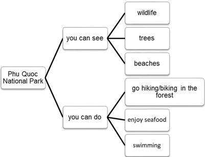 (Theo nhóm, hãy quyết định một điểm du lịch sinh thái mà bạn muốn đến nhất ở Việt Nam. Lập sơ đồ tư duy về những gì bạn có thể thấy và làm ở đó. Sau đó báo cáo trước cả lớp.)