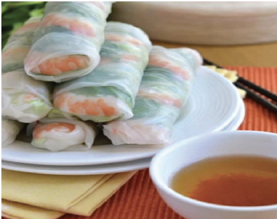 6 – c. Put some mint leaves on the paper, add 4 pieces of shrimp, a bit of lettuce, some bean sprouts, some rice noodles on top.