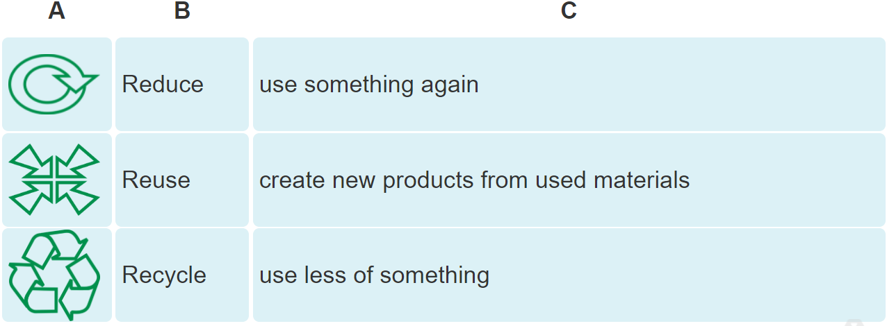 1. The three Rs stands for Reduce- Reuse – Recycle. Draw a line from a symbol in column A to its matching word in column B and its meaning column C.