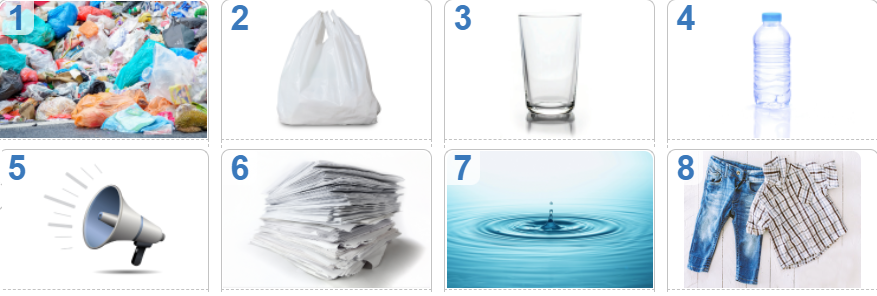rubbish         plastic bottle       glass        noise        plastic bag        paper        water        clothes