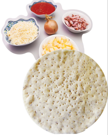 tomato sauce (sốt cà chua), onion (hành), cheese (phô mai), apple (táo), bacon (thịt ba rọi), pizza base (vỏ pizza) => pizza