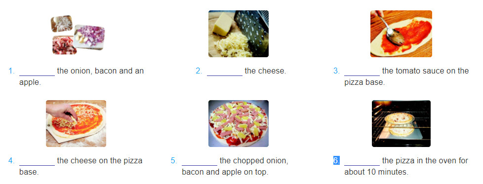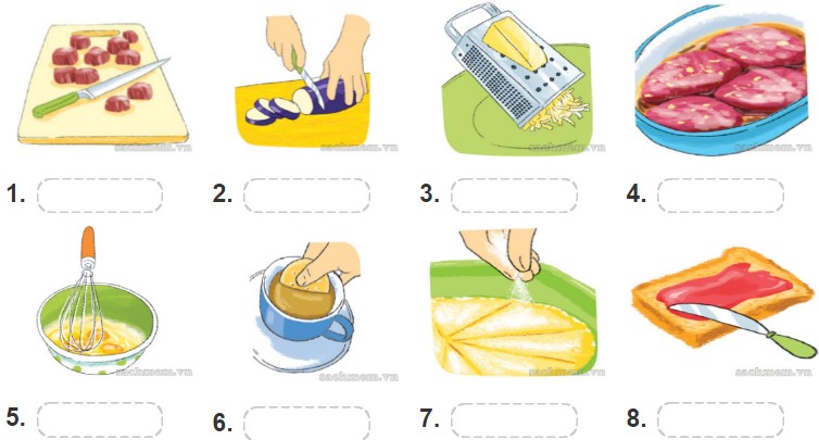 (Viết các động từ chuẩn bị món ăn trong khung dưới những bức tranh.)