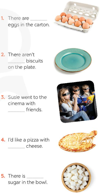 1. some 2. any 3. some 4. a lot of 5. a lot of