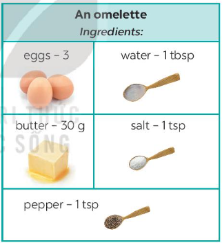 (Chúng ta cần trứng, nước, bơ, muối và hạt tiêu.)