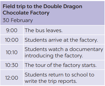2. Read the schedule of the field trip for the grade 8 students tomorrow, and underline the verbs in the sentences. Then answer the questions.