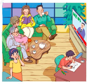 1. Lan’s mother was reading a book while Lan’s grandparents watched TV.