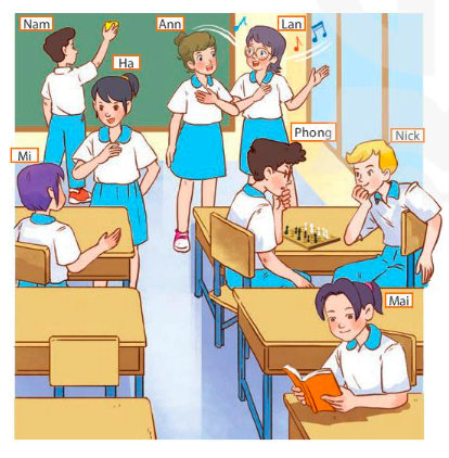(Ann và Lan đang hát trong khi Nam đang lau bảng.)