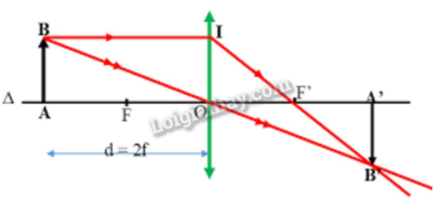 Vật AB có độ cao h = 3 cm được đặt vuông góc trước một thấu kính hội tụ có tiêu cự f = 5 cm, điểm A nằm trên trục chính và cách thấu kính một khoảng d = 2f.