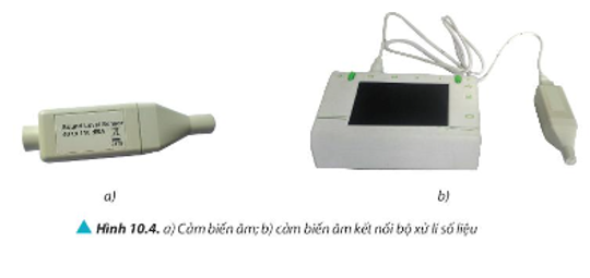 Cảm biến âm là cảm biến có nguyên tắc hoạt động tương tự micrô. Khi sóng âm được truyền tới cảm biến thì nó sẽ chuyển tín hiệu âm thành tín hiệu điện có cùng tần số. Kết nối cảm biến âm với bộ xử lí số liệu sẽ thu được tín hiệu điện này trên màn hình (hình 10.4), dựa vào đồ thị và sự cài đặt tỉ lệ trục thời gian ban đầu ta có thể xác định được chu kì của tín hiệu.