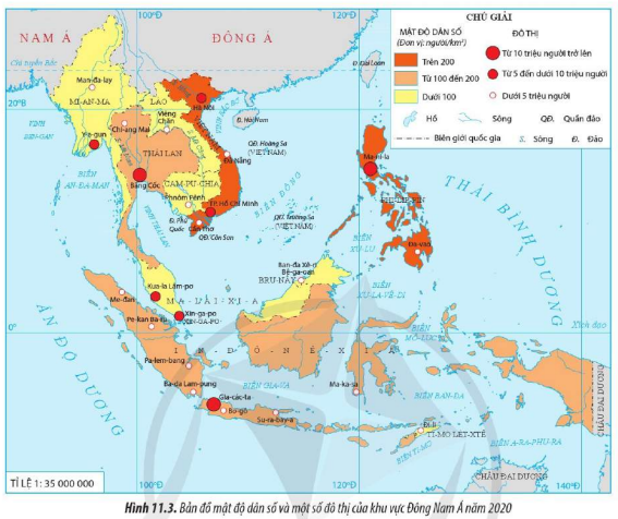 Quan sát hình 11.3, hãy đọc tên các nước có mật độ dân số trên 200 người/km2 và các đô thị có số dân từ 5 đến dưới 10 triệu người, từ 10 triệu người trở lên ở khu vực Đông Nam Á.