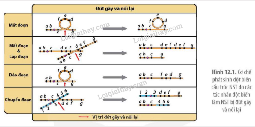 Quan sát Hình 12.1 và trình bày cơ chế phát sinh các dạng các đột biến cấu trúc NST.
