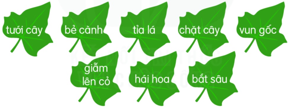 Em đọc kĩ các từ ngữ rồi lựa chọn từ chỉ chỉ hoạt động bảo vệ, chăm sóc cây.