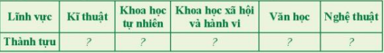 Hoàn thiện bảng thống kê một số thành tựu tiêu biểu về khoa học, kĩ thuật, văn học và nghệ thuật trong các thế kỉ XVIII – XIX theo mẫu dưới đây.