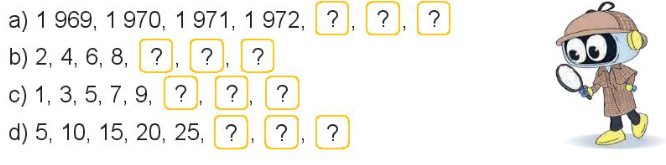 Xác định quy luật của dãy số đã cho rồi viết tiếp các số thích hợp vào chỗ chấm.
