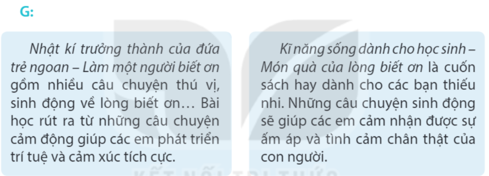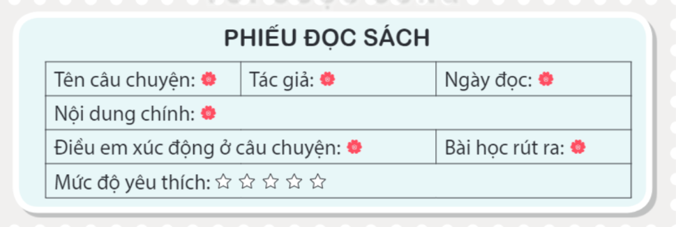 Đọc một câu chuyện về lòng biết ơn. Viết phiếu đọc sách theo mẫu. Trao đổi với bạn về nội dung chính và những điều em thấy xúc động trong câu chuyện. Chia sẻ với người thân câu chuyện về lòng biết ơn em đã đọc.