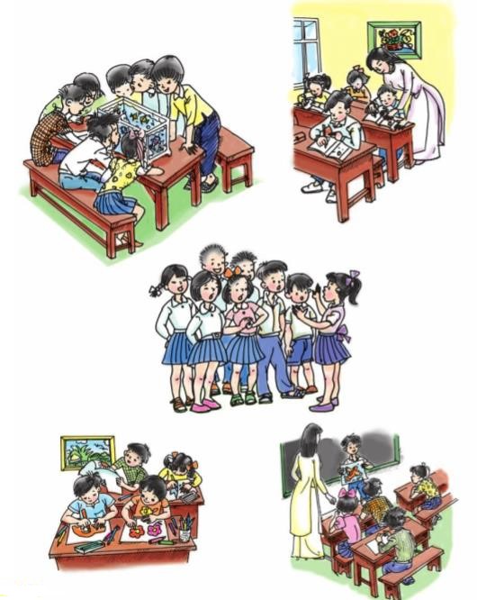 Quan sát các bức tranh và em hãy liệt kê các hoạt động của em và các bạn ở lớp. Hàng ngày, em được làm gì trên lớp. Các bạn trong bức tranh đang làm gì nhỉ?