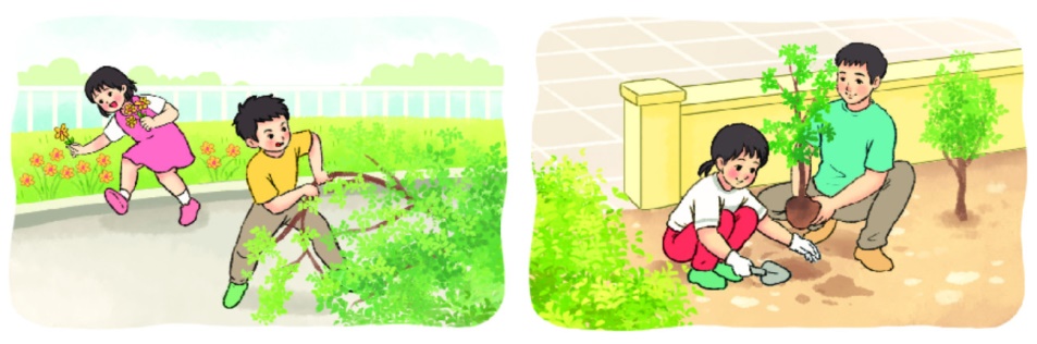 – Tranh 2: Hai bố con đang trồng xây xanh. Theo em đây là hành động nên làm vì nó giúp bảo vệ môi trường.