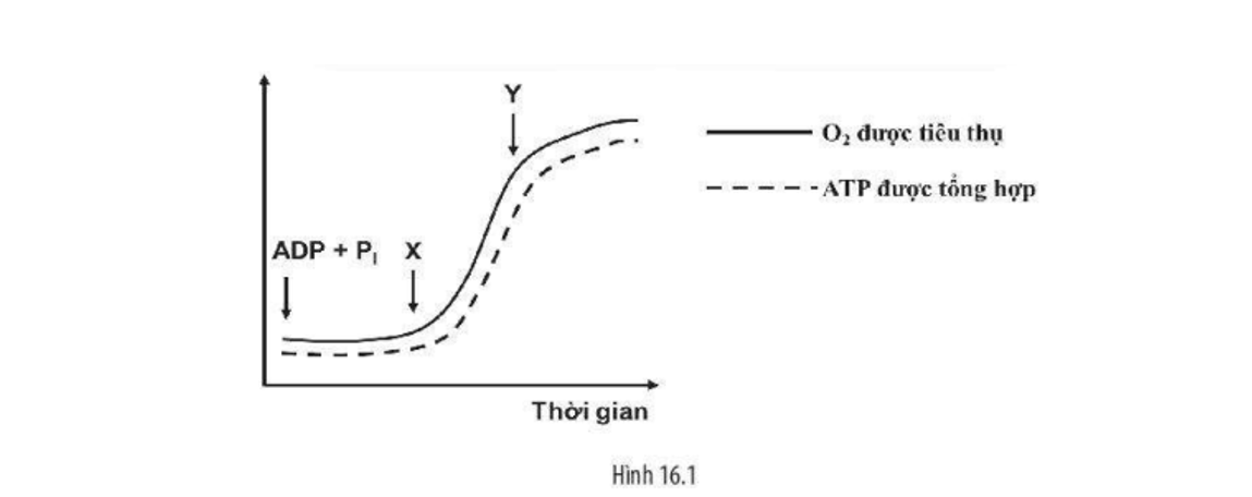 Khi cho một ti thể tinh sạch vào dung dịch đệm có chứa ADP, Pi. Sau đó lần lượt cho một chất X có thể bị oxi hóa và một phân tử Y vào trong dung dịch. Theo dõi quá trình hô hấp tế bào thông qua lượng O2 được tiêu thụ và lượng ATP được hình thành, người ta vẽ được đồ thị như Hình 16.1. Chất X và Y có thể là chất gì? Giải thích.