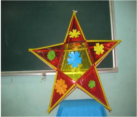 Đây là chiếc đèn ông sao do em tự làm. Chiếc đèn có hình ngôi sao năm cánh rất đẹp. Để làm được chiếc đèn này, chúng ta cần chuẩn bị thanh tre vót nhọn, giấy bóng kính, giấy màu, keo dán và dây thép li cố định. Đầu tiên, em vót các mảnh tre thành 5 que cho 1 mặt của ông sao và 10 que cho 2 mặt. Chẻ 4 que ngắn khoảng 15cm để đỡ cho 2 mặt của ông sao. Sau khi đã tạo ra 2 ông sao từ các thanh tre đã vót nhẵn sẵn, bằng nhau, em buộc chặt các góc để thành hình ông sao. Sau khi khung ngôi sao được chắc chắn, em lấy keo phết lên bề mặt của từng cánh sao để dán giấy bóng kính lên. Em sử dụng giấy bóng kính màu đỏ cho phần ngoài và màu vàng cho phần giữa để tượng trưng cho lá cờ Tổ quốc. Sau khi đã làm xong, em trang trí hoa tùy thích. Điểm đặc biệt nhất của chiếc đèn chính là nó có thể cho đèn led hoặc nến vào chính giữa đèn. Khi đèn sáng trông rất đẹp. Em rất thích chiếc đèn của em.