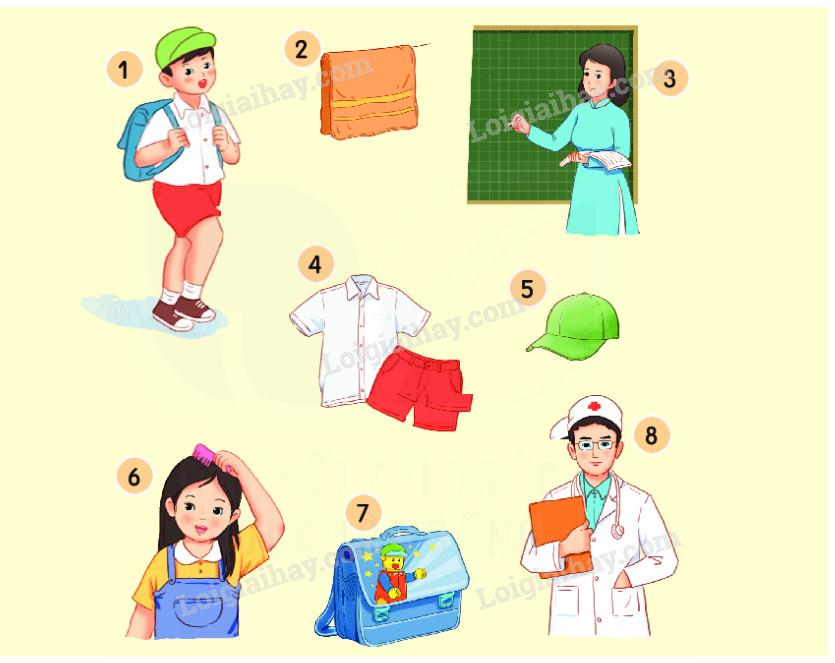 – Chỉ vật: cặp sách, mũ, khăn mặt, bảng, quần áo, lược, ống nghe, kính cận, sổ khám bệnh, sách, giày