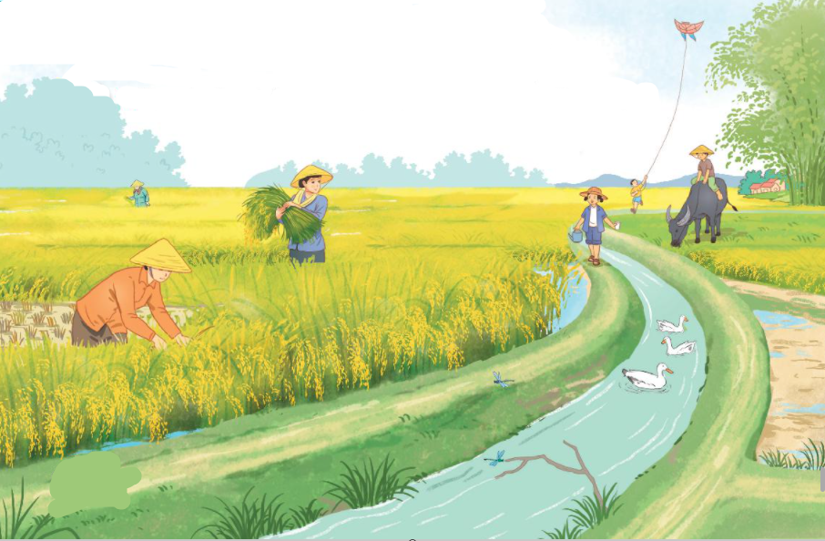M: Các cô bác nông dân đang gặt lúa.
