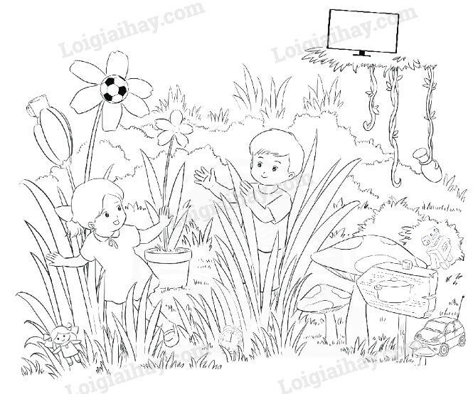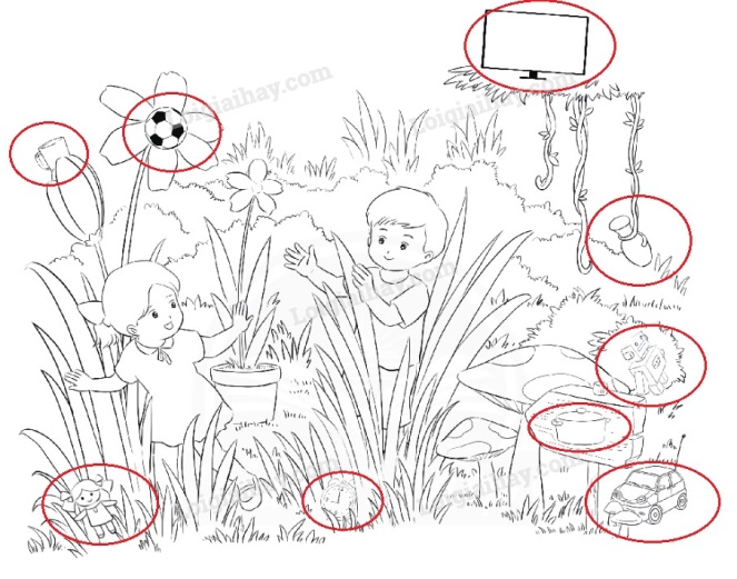 Em quan sát kĩ bức tranh để tìm các đồ vật được giấu trong bức tranh.