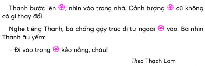 Nghe tiếng Thanh, bà chống gậy trúc đi từ ngoài vườn vào. Bà nhìn Thanh âu yếm: