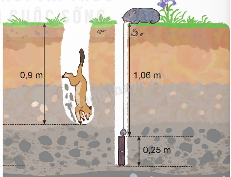 Dúi làm rơi khúc mía xuống một cái lỗ. Chồn đào một cái hố bên cạnh để lấy khúc mía cho dúi. Hỏi chồn còn phải đào sâu thêm bao nhiêu mét nữa để cái hố sâu bằng đúng cái lỗ?