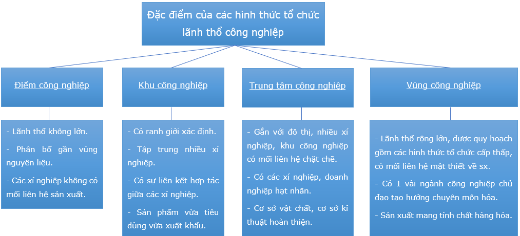Hoàn thành sơ đồ theo mẫu sau để thể hiện đặc điểm của các hình thức tổ chức lãnh thổ công nghiệp.