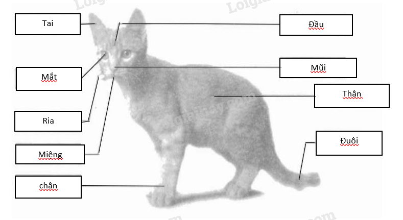 Em hãy quan sát con mèo và viết tên các bộ phận của nó vào ô trống. Mèo có những bộ phận như đầu, mắt, thân, chân…..