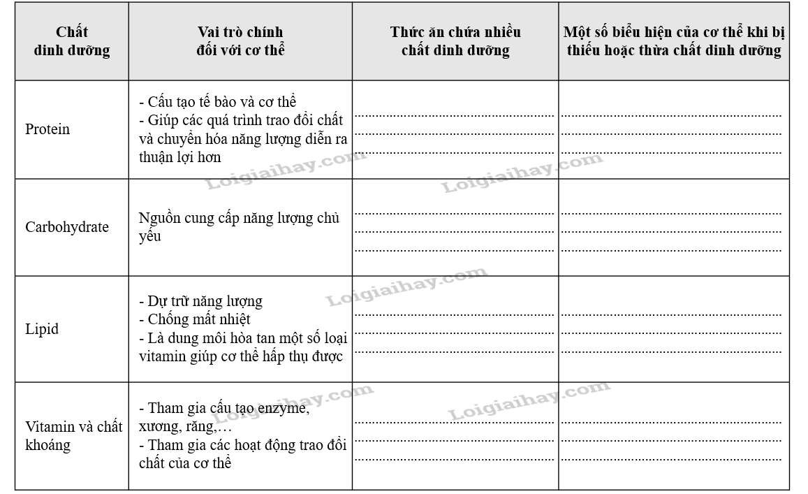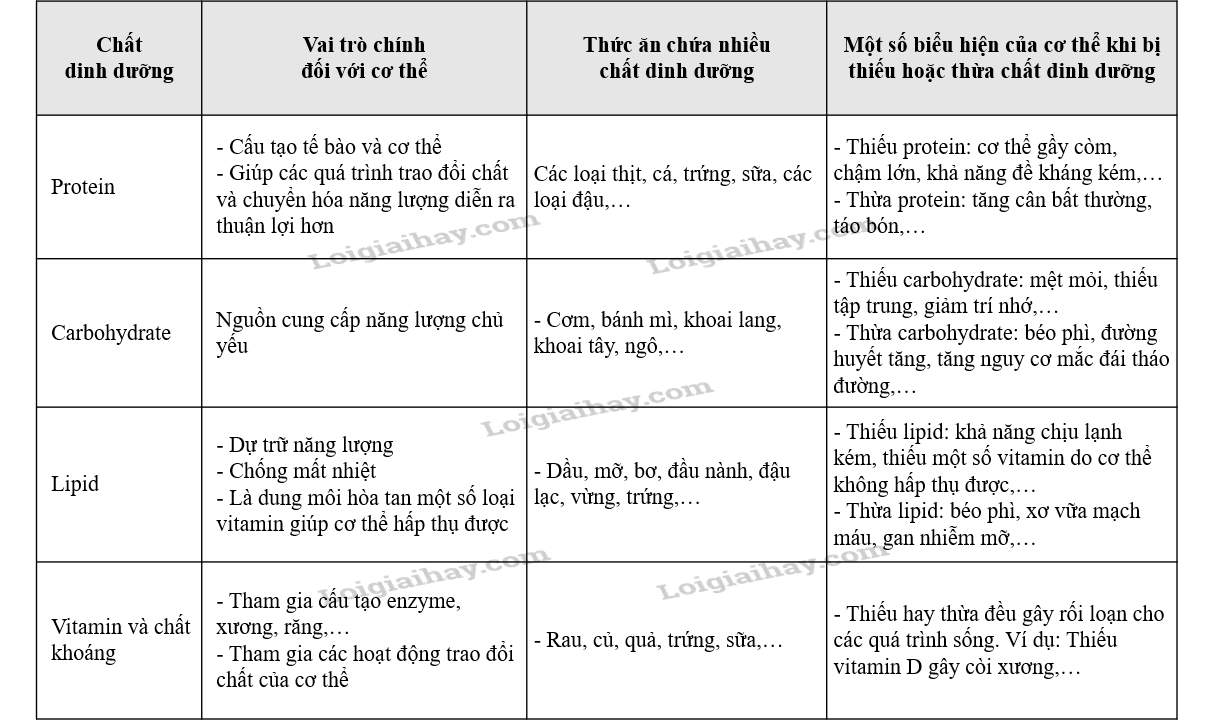 Nắm được vai trò của các chất dinh dưỡng và một số biểu hiện khi cơ thể bị thiếu/thừa chất dinh dưỡng.