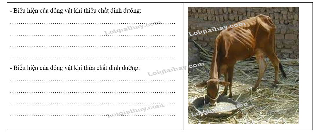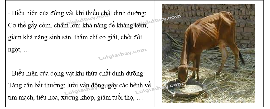 Hình dưới thể hiện động vật bị thiếu chất dinh dưỡng. Hãy tìm hiểu và nêu một số biểu hiện của động vật khi bị thiếu hoặc thừa chất dinh dưỡng