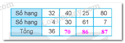 Ta lấy số hạng cộng số hạng rồi viết tổng 2 số vào ô trống cho thích hợp.